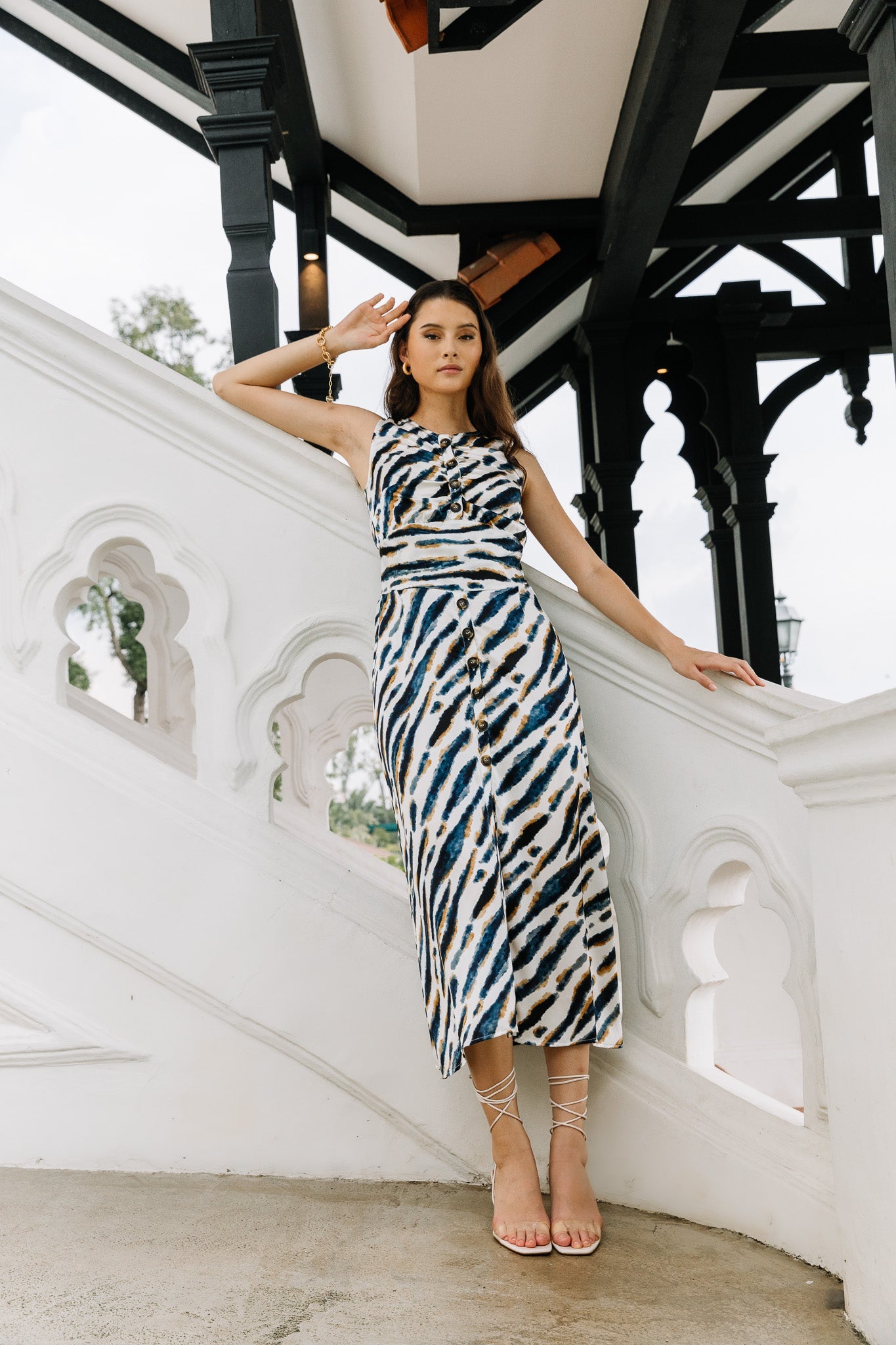 A sleeveless, midi dress with button up front and a flattering bias cut waist band. This lightweight silk dress comes in an abstract zebra stripe print. Invisible side zipper opening.