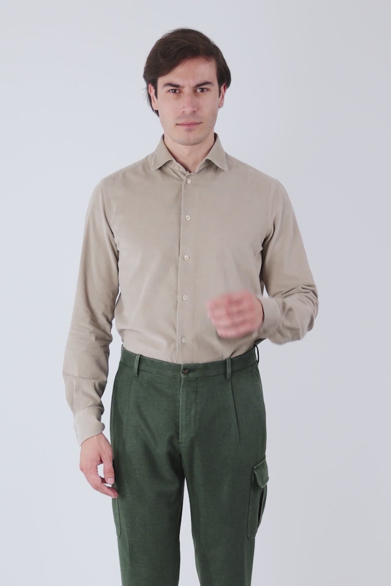 The Polvica shirt, emblem of Claudio Mariani's Made in Italy sartorial excellence, combines a classic design with a regular fit, crafted from high-quality soft corduroy. Subjected to an exclusive dyeing and washing treatment, this shirt features a unique and lived-in finish, giving a distinctive and contemporary charm to the fabric. The combination of softness and durability of the velvet offers enveloping comfort, perfect for any occasion.