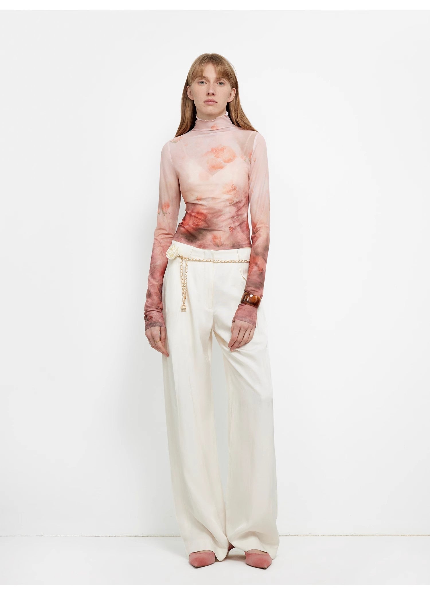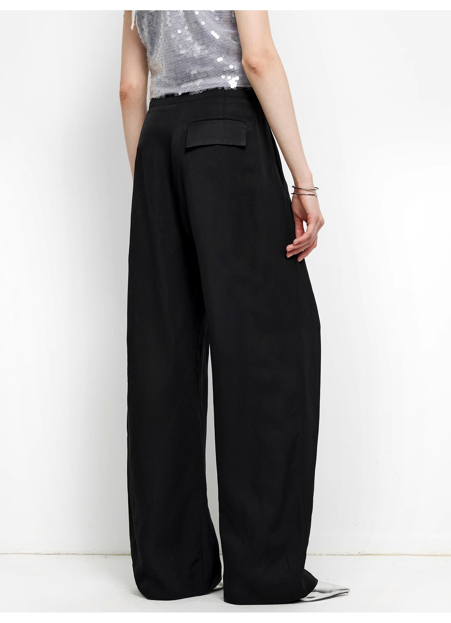 These mid-waist, draped straight-leg pants feature a generous amount of fabric in the legs, perfectly flattering various body types and leg shapes. They contour to different waist and abdominal curves, effortlessly optimizing body proportions and creating a slimming effect. The diagonal single pleat and split seam details add a layered, textured look, visually expanding the width of the pants and balancing the space and freedom of movement in the legs. These pants are universally flattering and suitable for all body types.