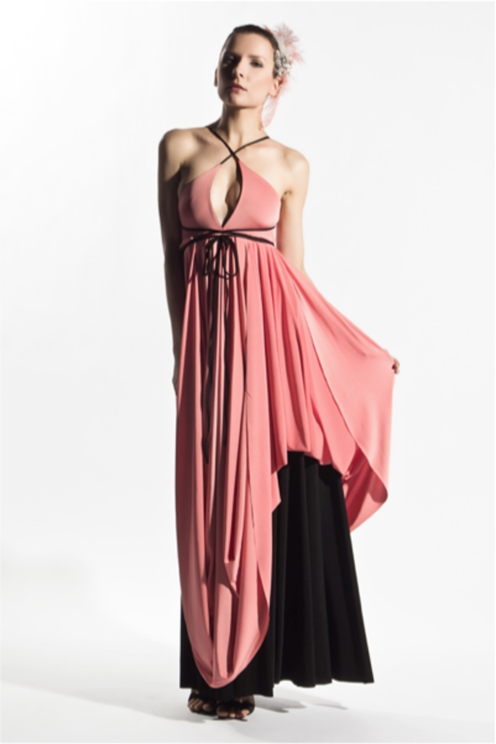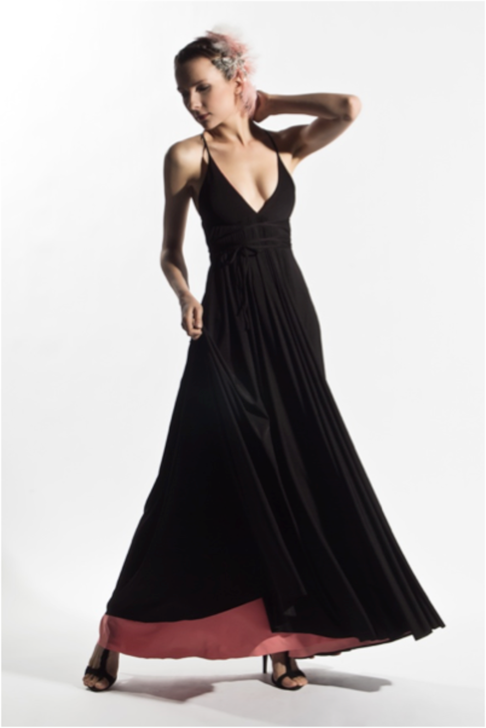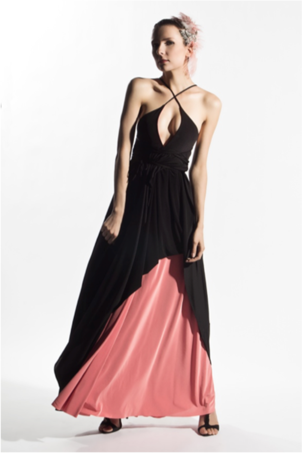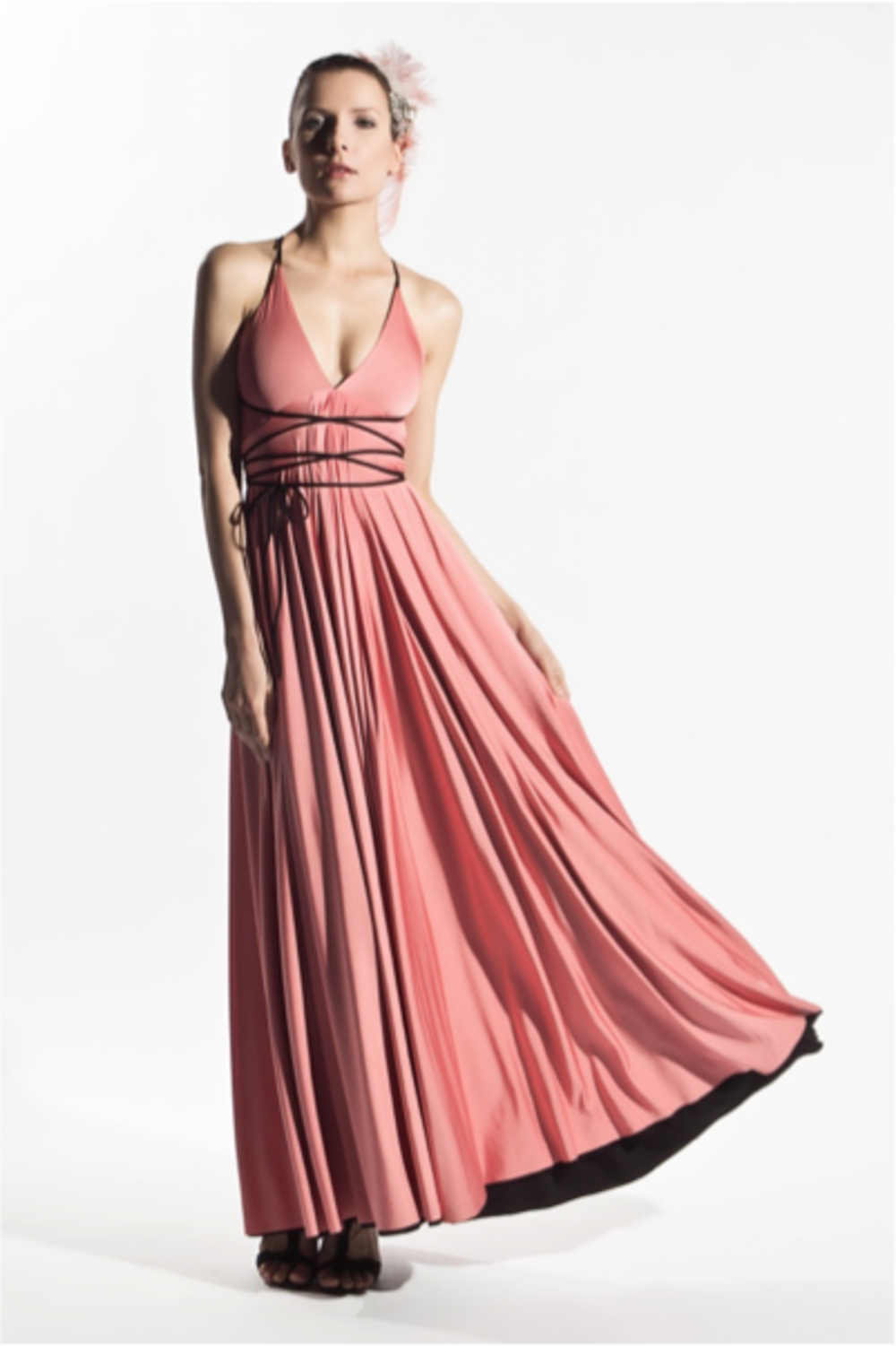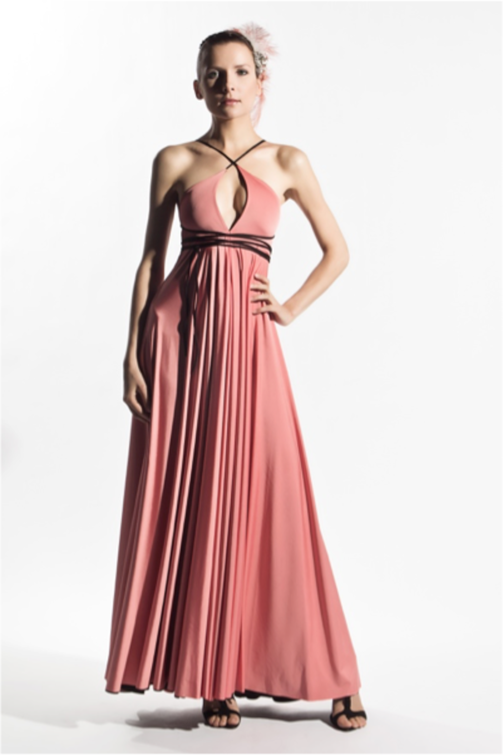 Full length gown has triangle top with empire waist and dual layer circle skirts; spaghetti straps criss cross over partially exposed back and around waist; comes with removable flutter epaulettes. This transformable dress can be worn inside out and outside in, while the straps can be criss-crossed or worn straight over the shoulder.